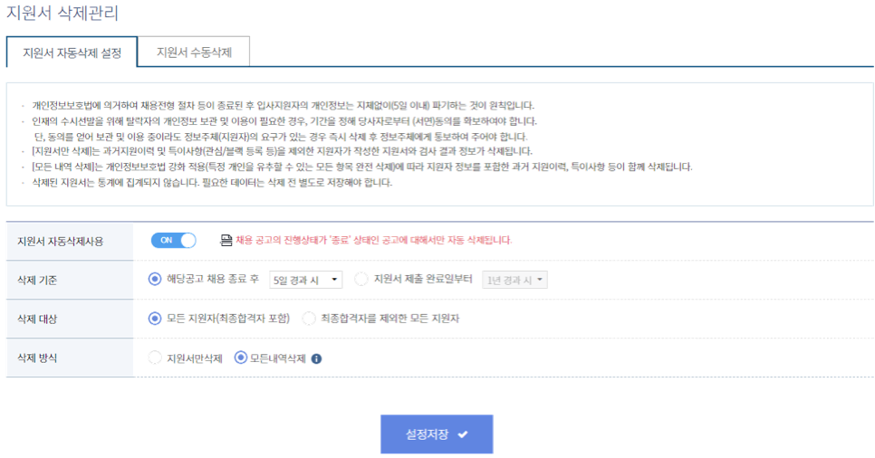 AI역량검사를 운영하는 관리 시스템은 각 기업이 지원자에게 안내한 보관 기간에 따라 개인정보 관련 자료를 파기할 수 있는 수동파기와 자동파기 기능을 제공한다.
