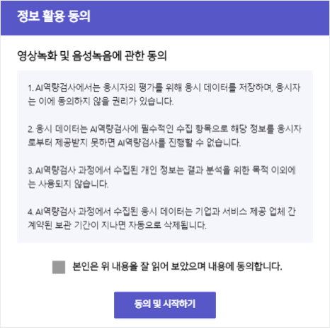 AI역량검사는 응시 전에 영상녹화/음성녹음과 활용 목적을 안내하고 응시자의 동의를 받고 있다.
