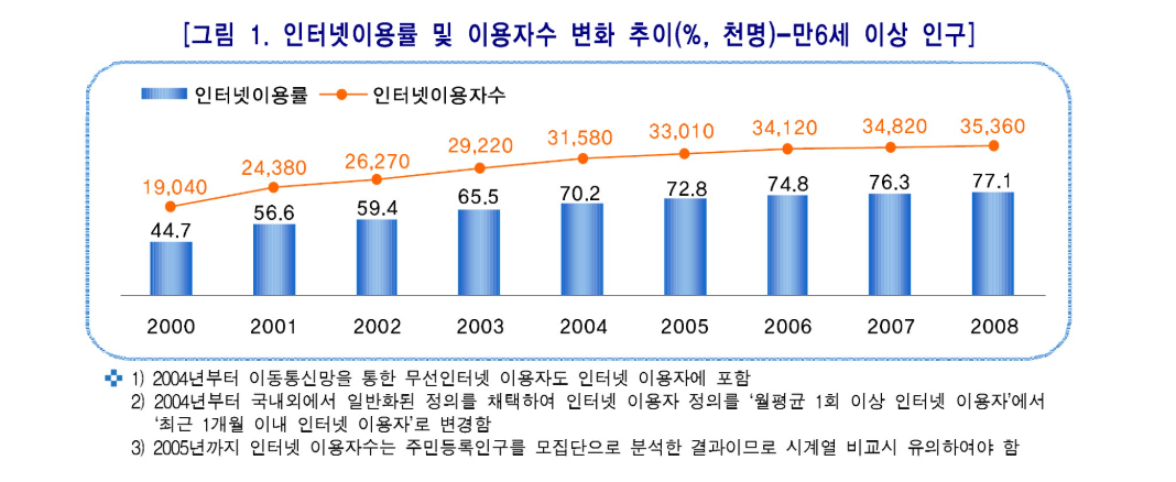 NIA(한국지능정보사회진흥원)의 자료에 따르면, 1999년 22.4%였던 인터넷 이용률은 다음 해인 2000년에는 두 배 증가한 44.7%, 2005년에는 72.8%까지 치솟았습니다.