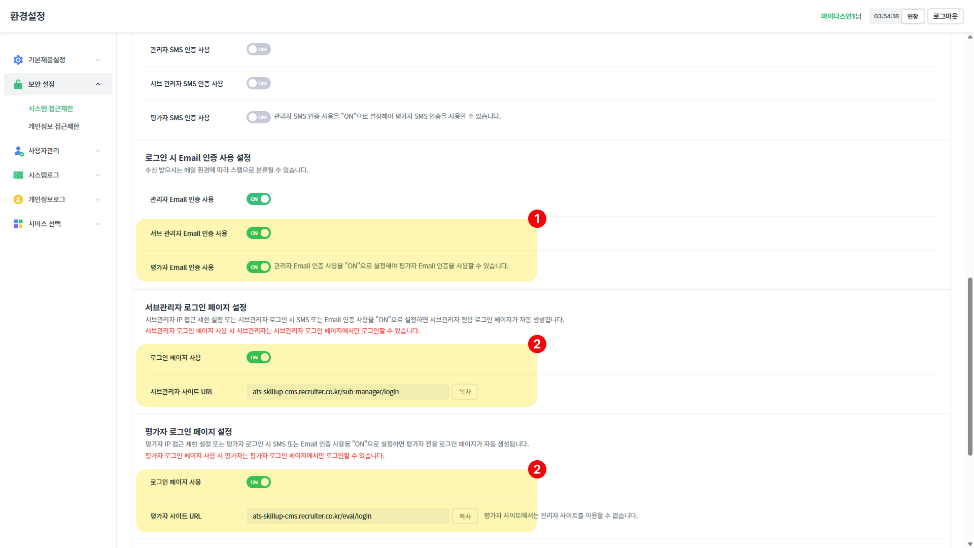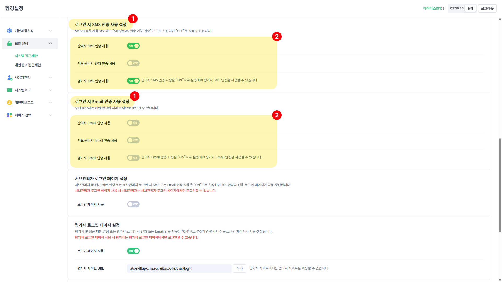 관리자, 서브 관리자, 평가자의 로그인 시 SMS 또는 이메일 2차 인증은 [환경설정] > [보안설정] > [시스템 접근제한]에서 설정합니다. 권한 별 인증 설정 시 평가자 인증은 관리자 인증이 활성화된 경우에만 사용할 수 있으며, 인증 사용 시 권한 별 전용 로그인 페이지가 생성됩니다.