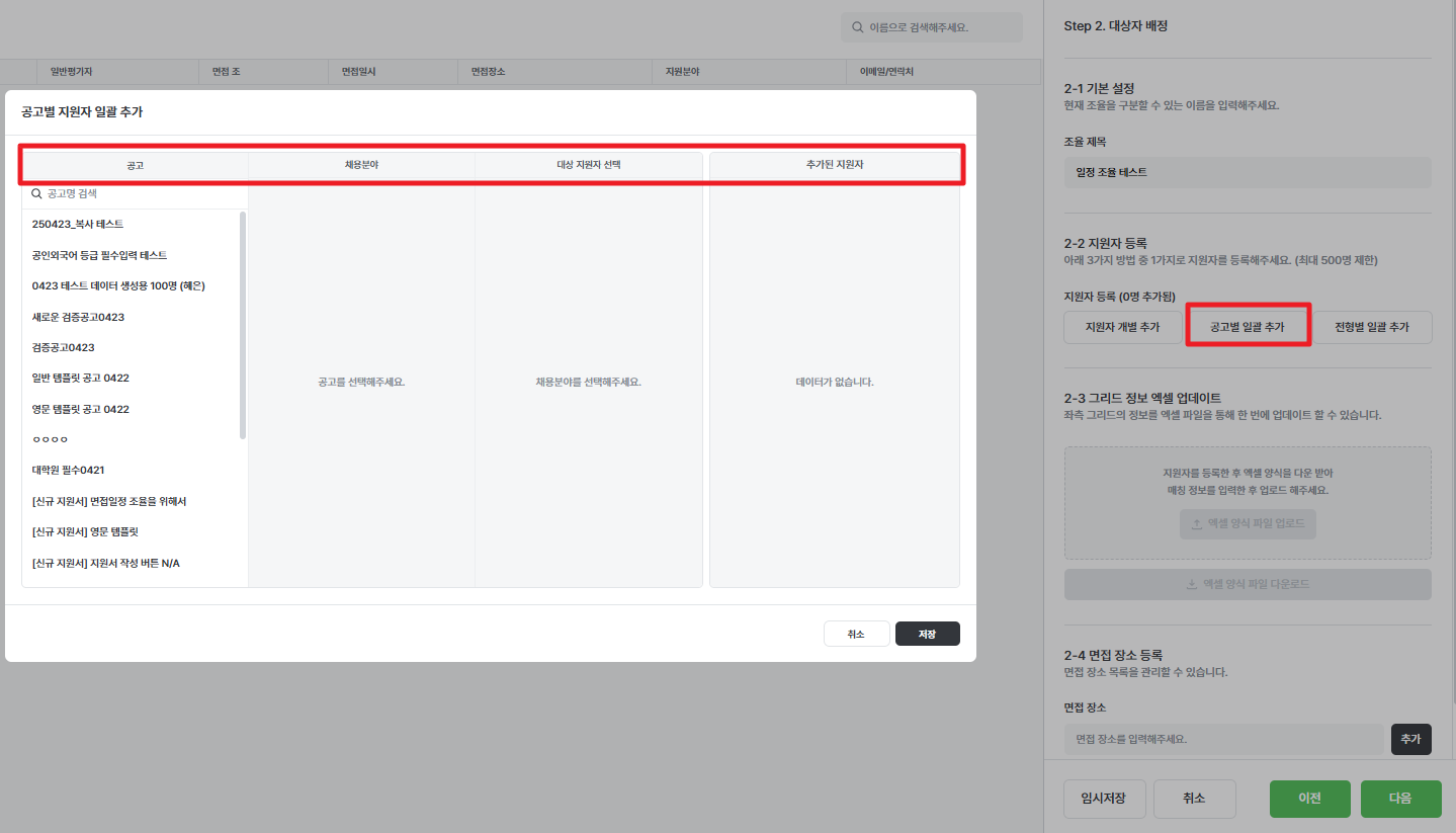 ✔️ 공고별 일괄 추가 버튼을 통해 STEP.1에서 생성한 면접 시간에 배정이 필요한 지원자를 일괄 추가할 수 있습니다.