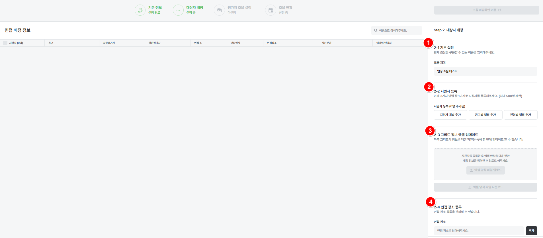 본 가이드는 기본정보 > "대상자 배정" > 조율 설정 단계입니다.