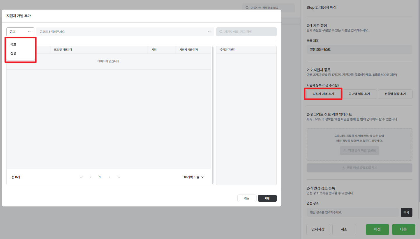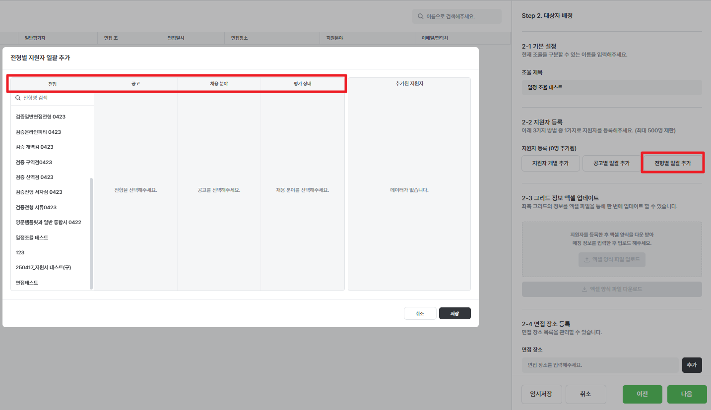 (전형별 공고/채용분야/평가상태를 기준으로 일괄 추가할 수 있습니다.)