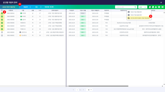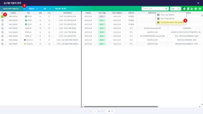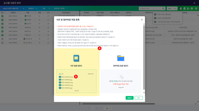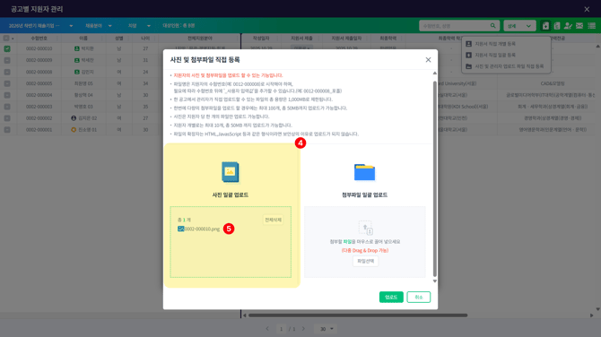 [지원자] > [공고별 지원자] > 해당 지원자 선택 > [사진 및 관리자 업로드 파일 직접 등록]