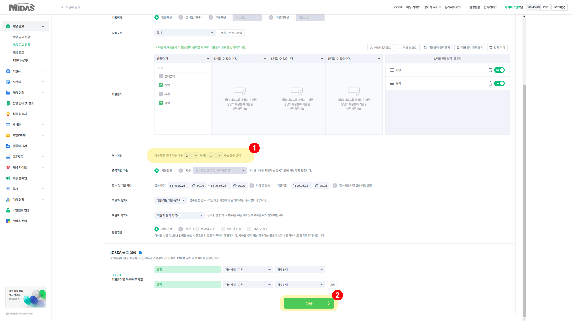 한 공고 내 여러 채용분야를 1지망·2지망 형태로 지원받기 위해서는 [복수지원] 기능에서 최대 허용 개수와 최소(필수) 선택 개수를 설정해야 합니다. 최대 허용 개수를 2개로 설정하면 1지망·2지망 구조로 운영됩니다.