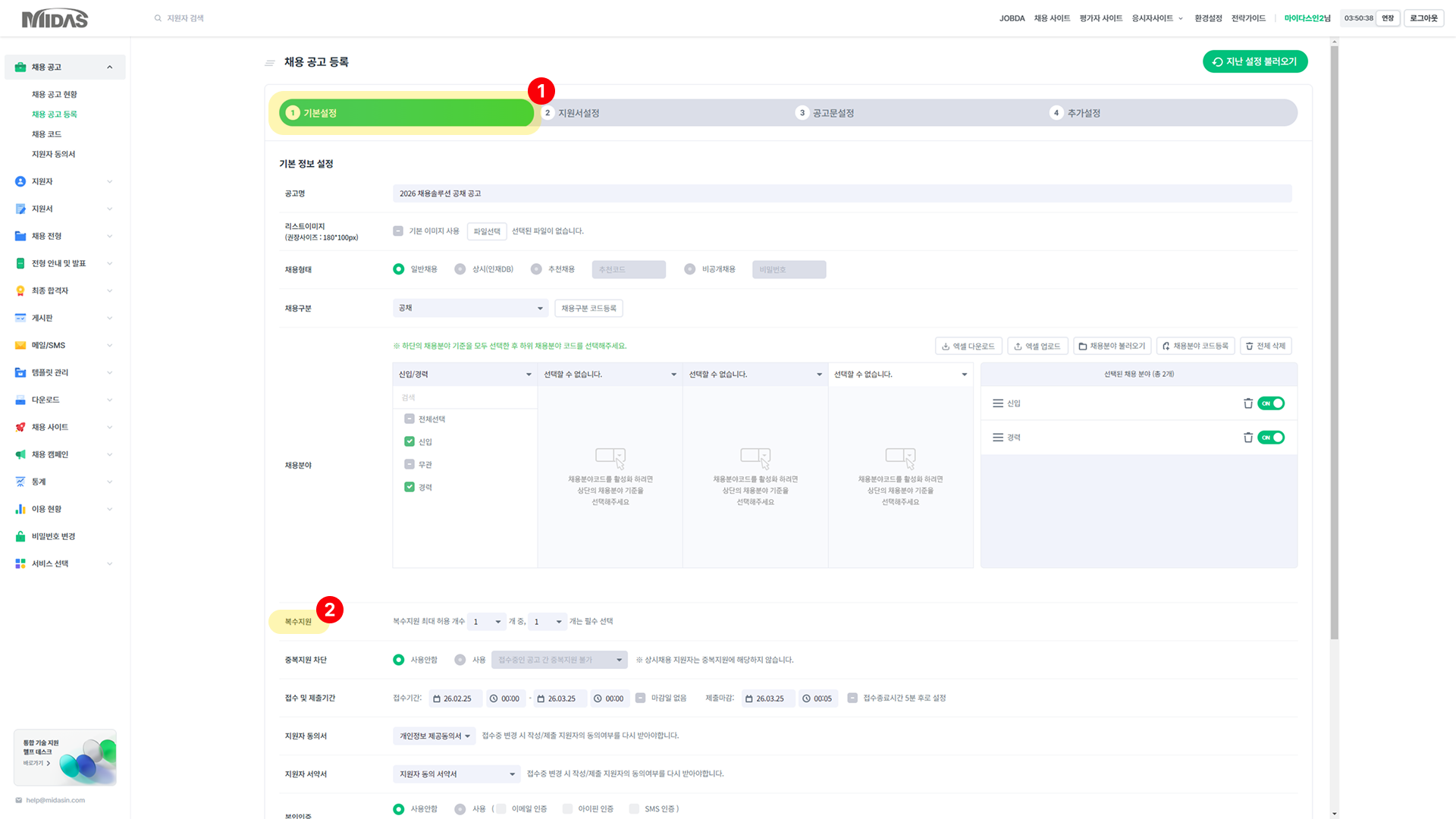한 공고 내 채용분야 선택 개수는 [복수지원] 설정으로 제어되는 구조