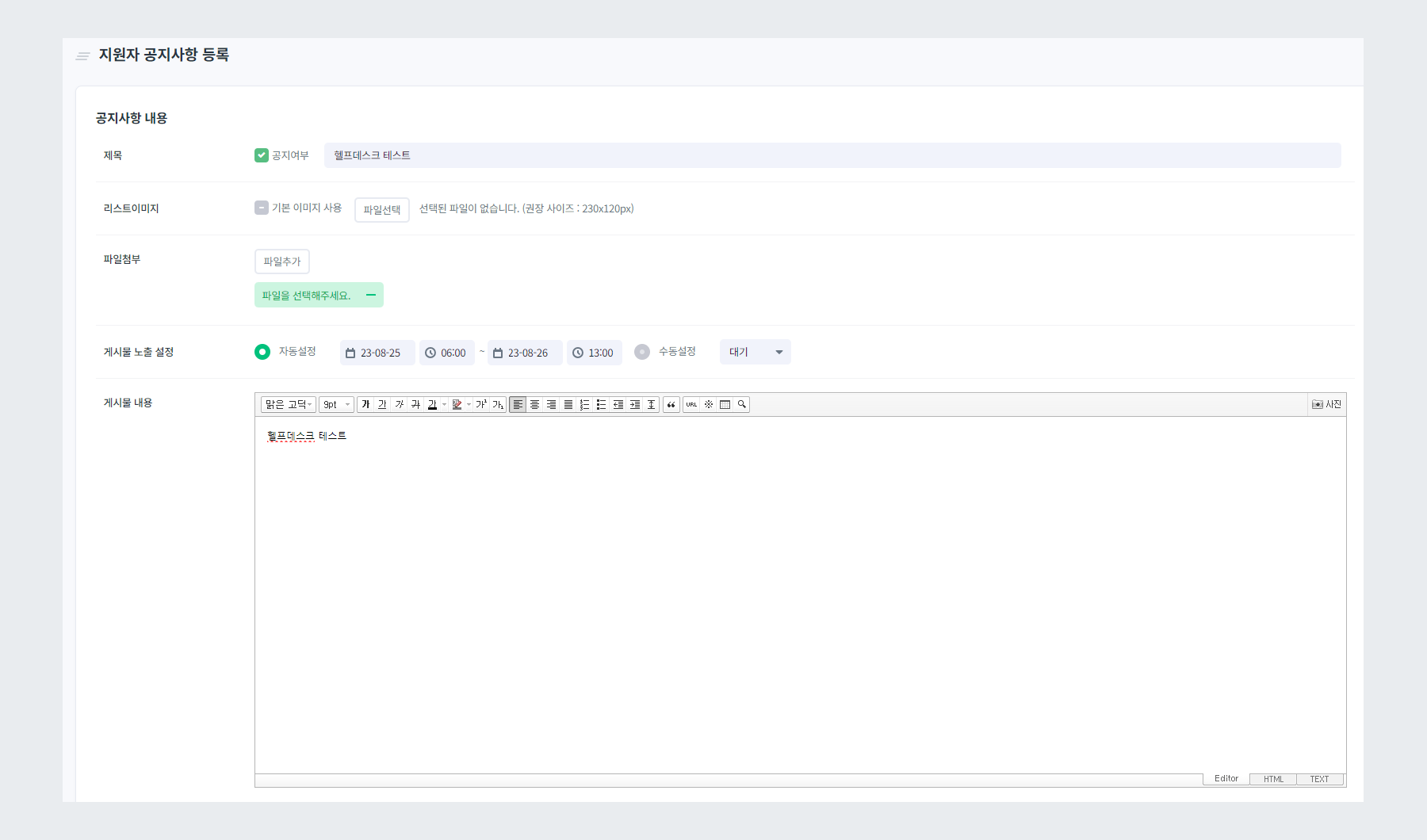 - 공지 여부에 체크하면, 제목 앞에 공지 아이콘이 표시됩니다.