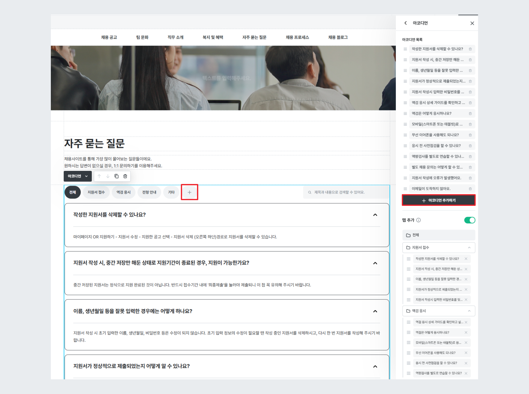 '아코디언 추가하기'로 질문 추가를 할 수 있고, '+'를 눌러 질문 탭을 관리할 수 있습니다.
