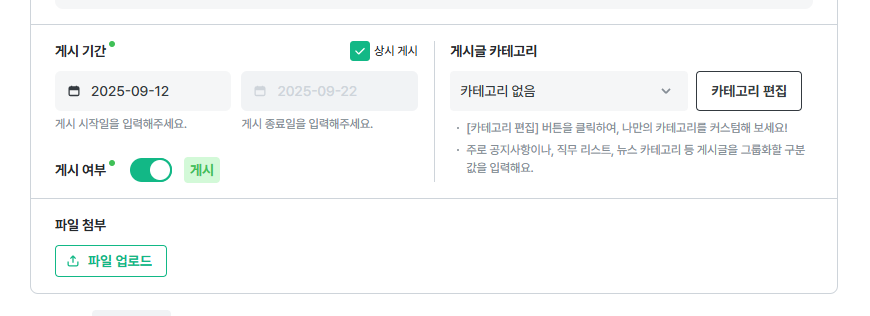 - '상시 게시'를 선택하면 종료일과 상관없이 게시글이 계속 노출됩니다.