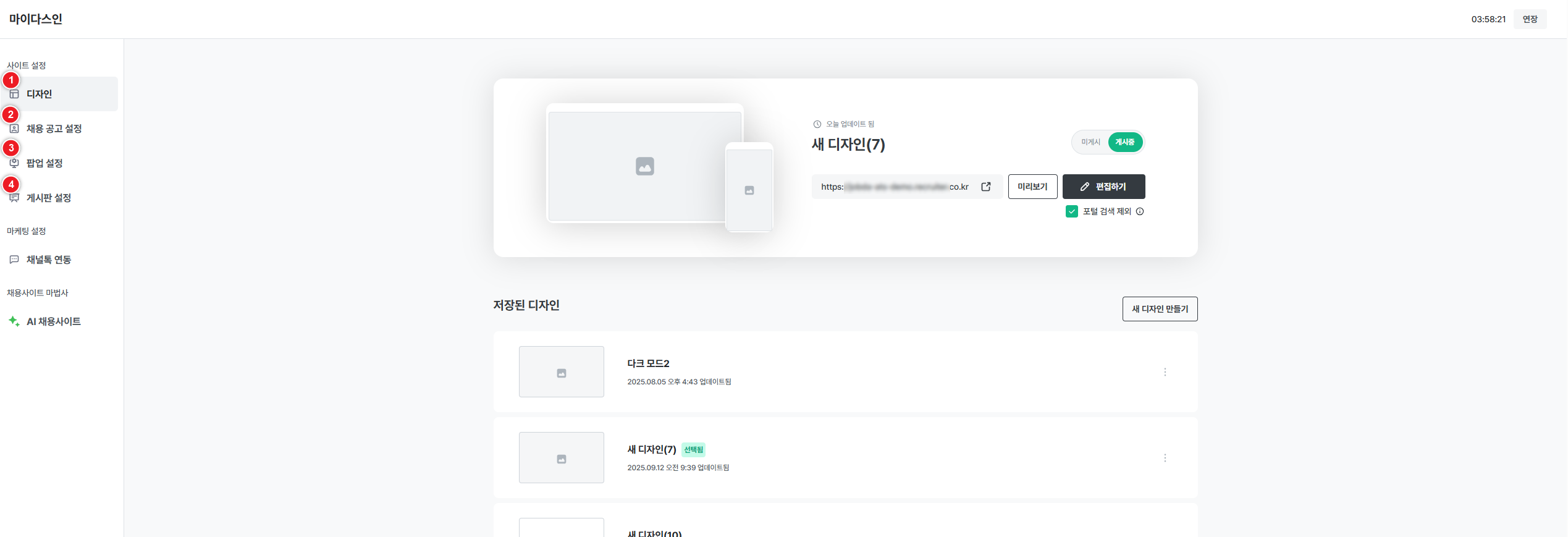- 현재 게시 중인 채용 사이트 템플릿의 편집 및 미리보기가 가능합니다.