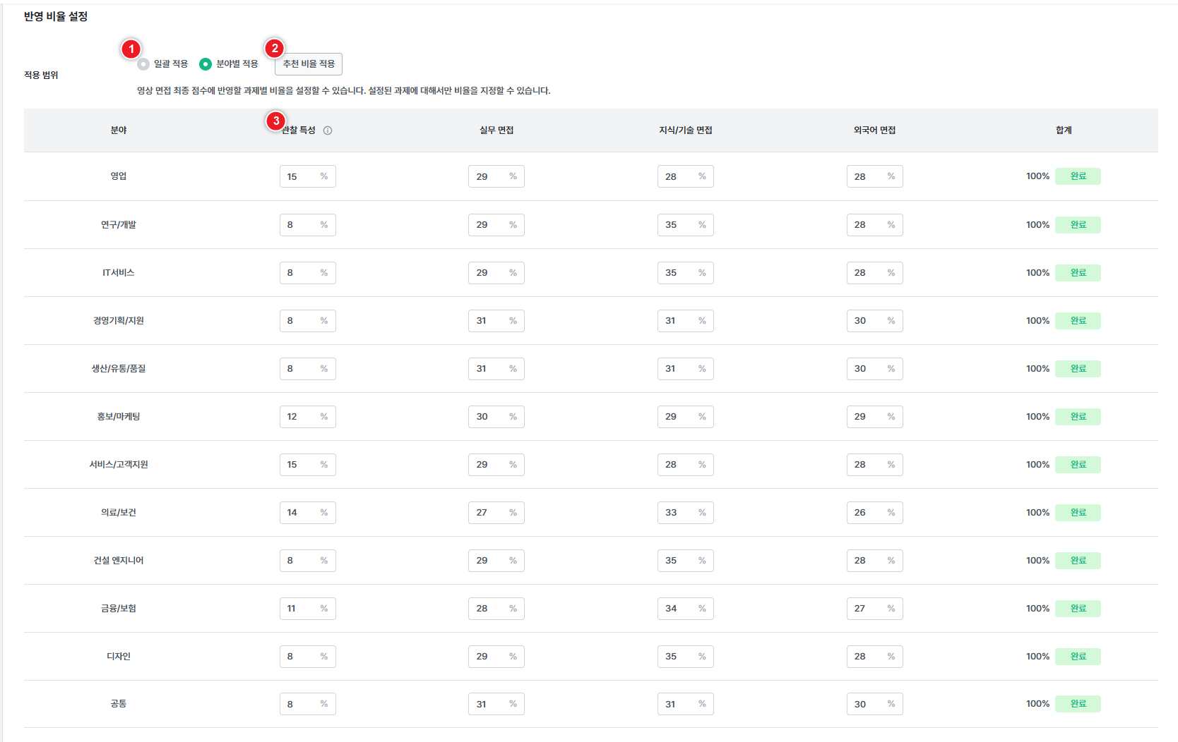 1. 적용범위- 반영 비율을 전 분야에 일괄 적용할지, 분야별로 개별 적용할지 설정합니다.
