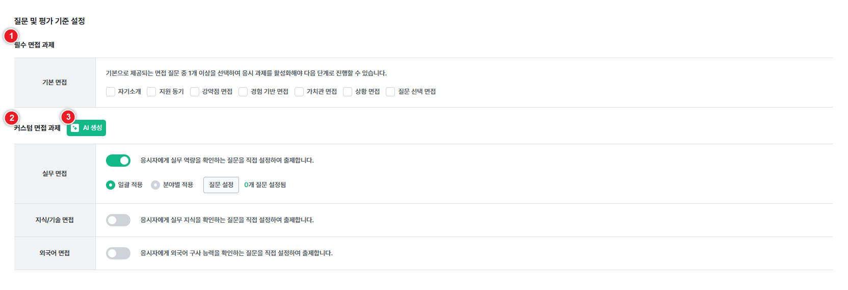 3. AI 설정 : 커스텀 면접의 ‘AI 생성’ 기능은 영상 면접 유형을 ‘평가형’ 으로 선택한 경우에만 사용 가능합니다.