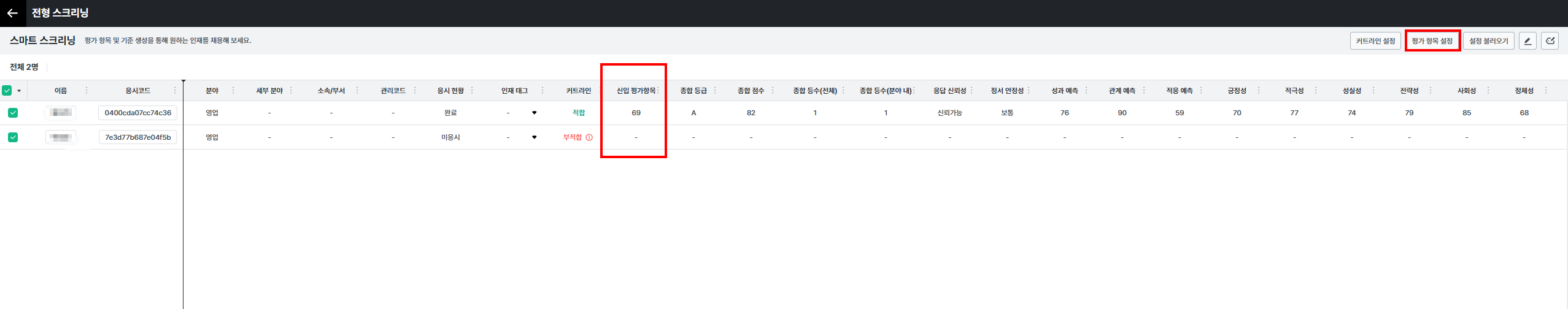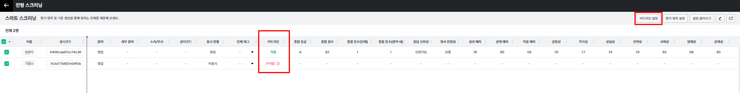 - 생성된 평가항목 점수와 기존 역량들의 커트라인 점수를 설정하여 기준에 부합하거나 미달된 인원을 확인할 수 있습니다.
