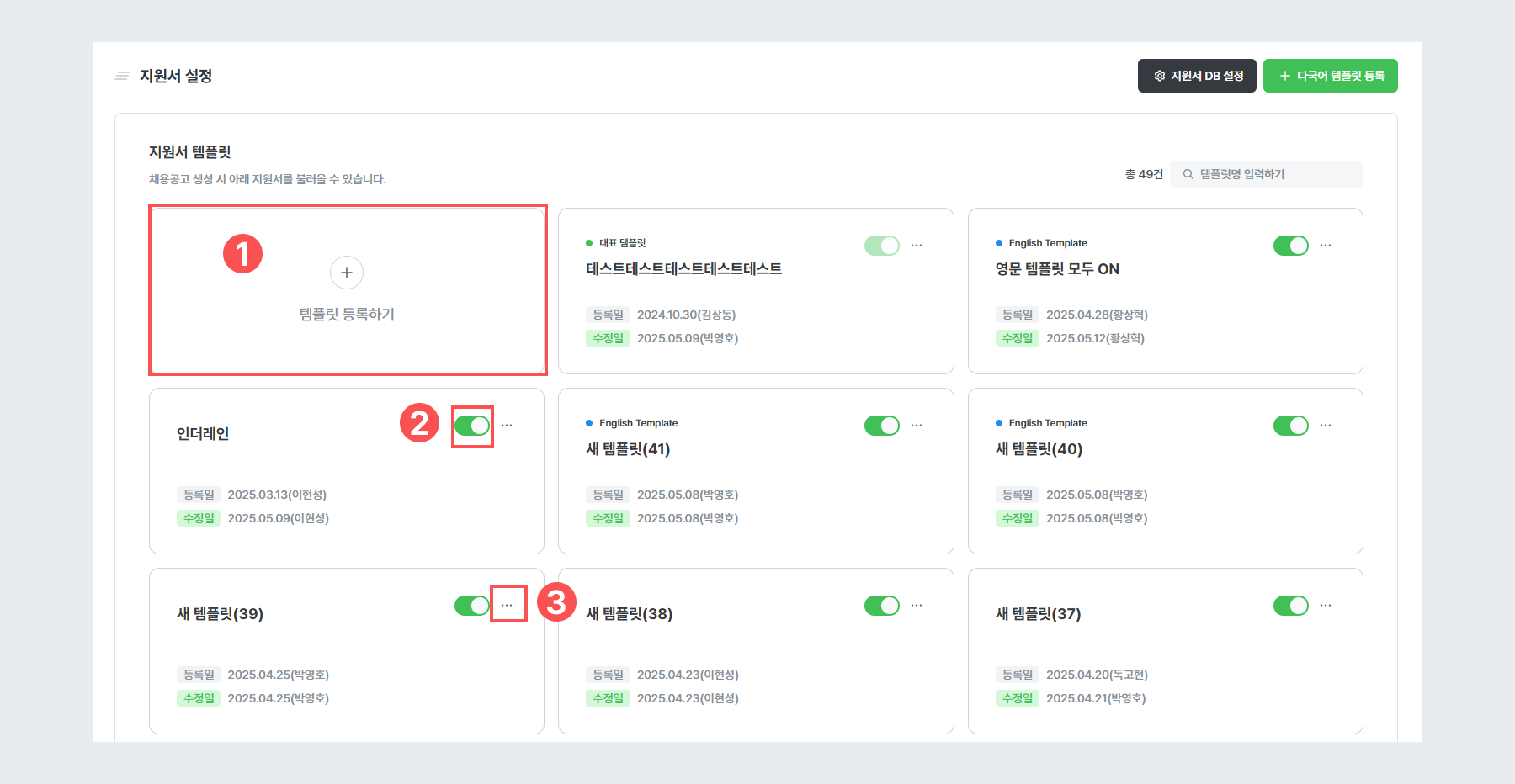 ① 템플릿 등록하기 : 지원서 템플릿을 새로이 등록할 수 있습니다.