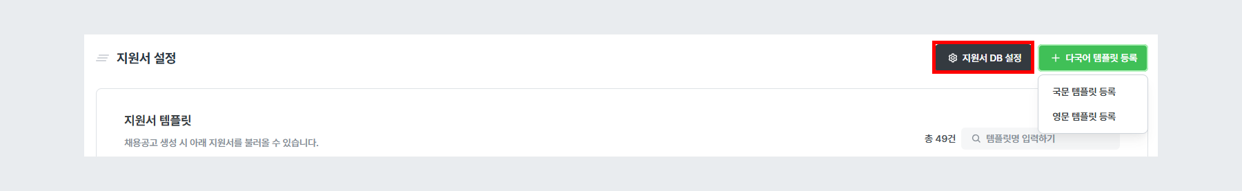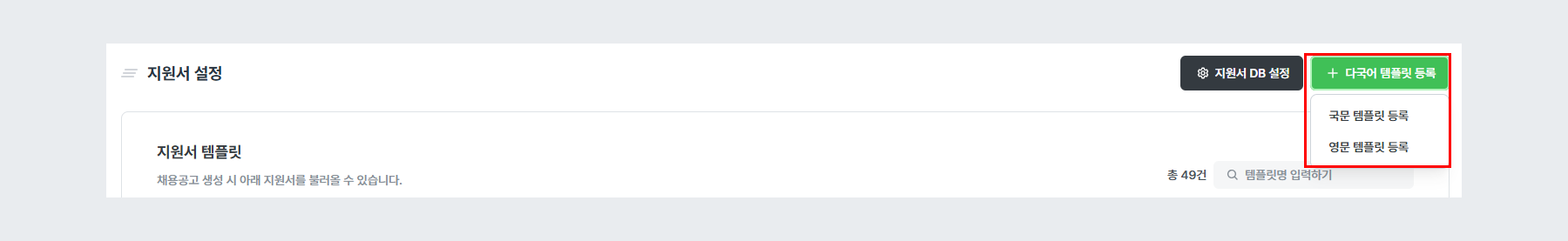 다국어 템플릿 등록 > 영문 템플릿 등록을 통해 영어 버전의 지원서를 작성할 수 있습니다.