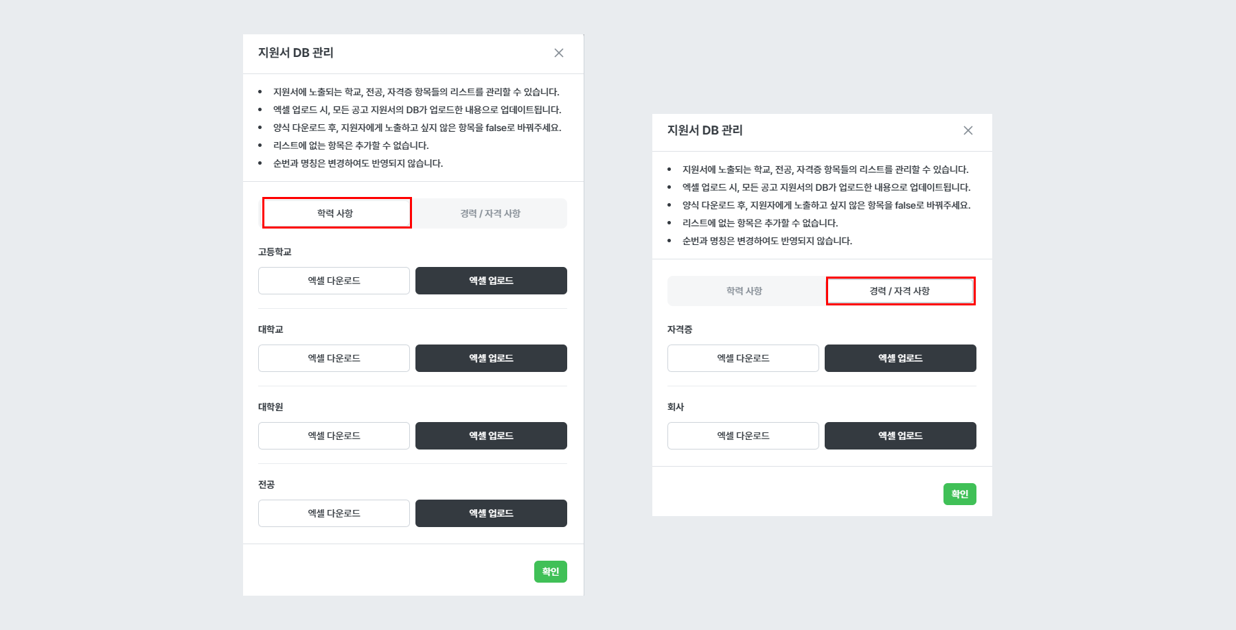 지원서 DB 관리를 통해 지원서에 노출되는 학교, 전공, 자격증 등의 항목 리스트를 관리할 수 있습니다.