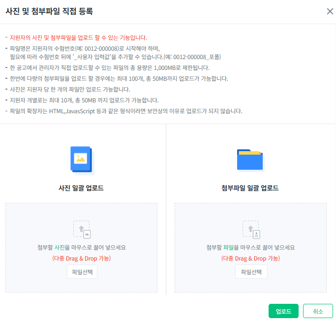 앞선 지원서 직접 개별 등록 혹은 지원서 직접 일괄 등록으로 추가하지 못한 사진 및 이력서 파일들을 추가로 등록 가능합니다. 파일명은 지원자의 수험번호(ex. 0012-000008)과 같이 동일한 경우에만 업로드 가능합니다.