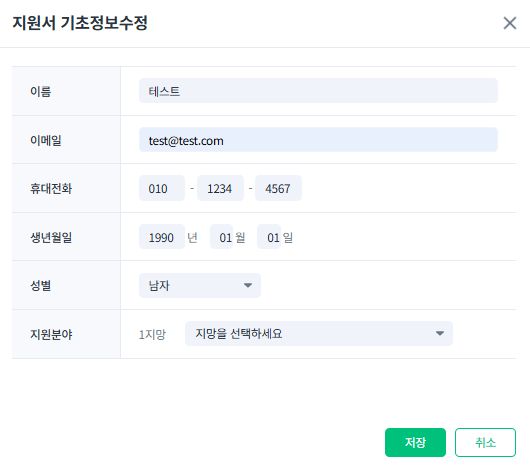 지원자 이름, 지원분야, 이메일, 휴대전화 정보와 같은 필수 값만 입력하여 지원서를 직접 등록할 수 있습니다. 한 번에 한 명 씩 등록 가능합니다.