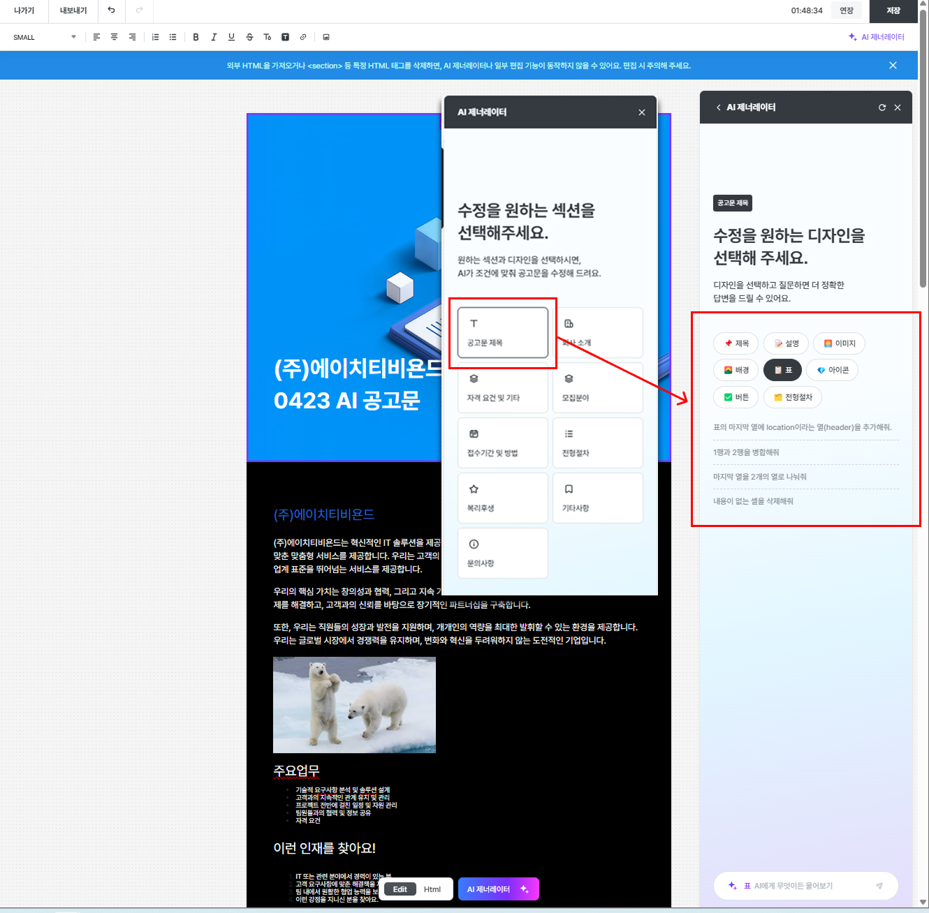 - 선택한 섹션에 대해 AI 제너레이터를 통해 HTML을 생성하거나 수정할 수 있는 기능입니다.