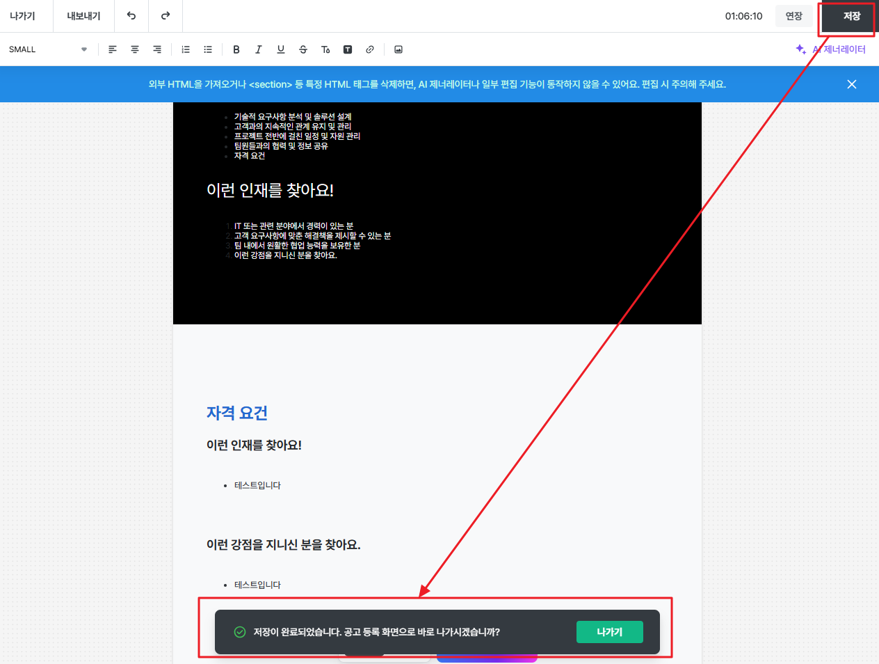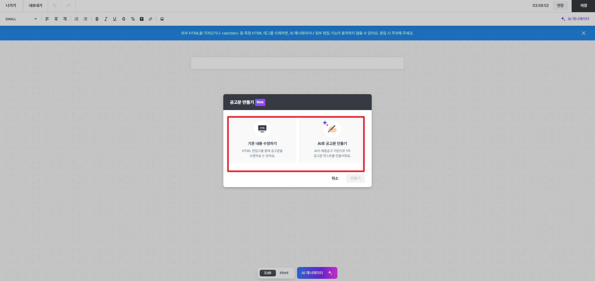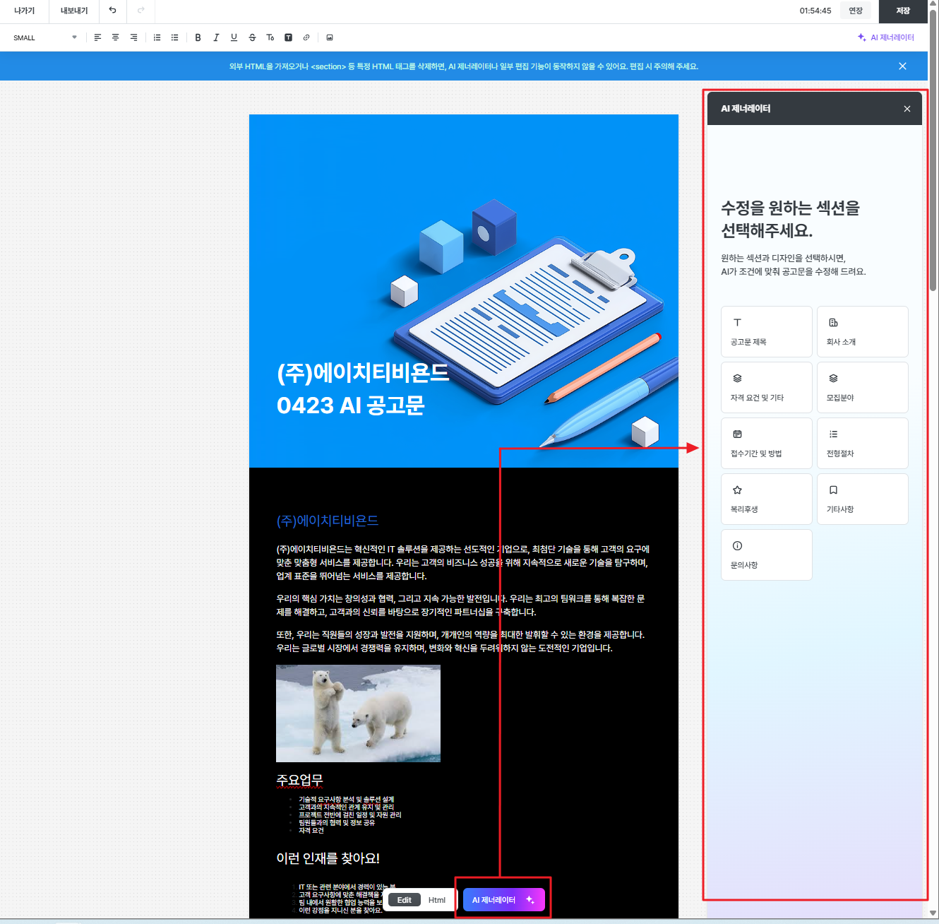 - 기존 입력 화면과 동일하게 Edit / HTML 모드 전환이 가능하며, 해당 화면 내에서 AI 제너레이터도 함께 사용할 수 있습니다.
