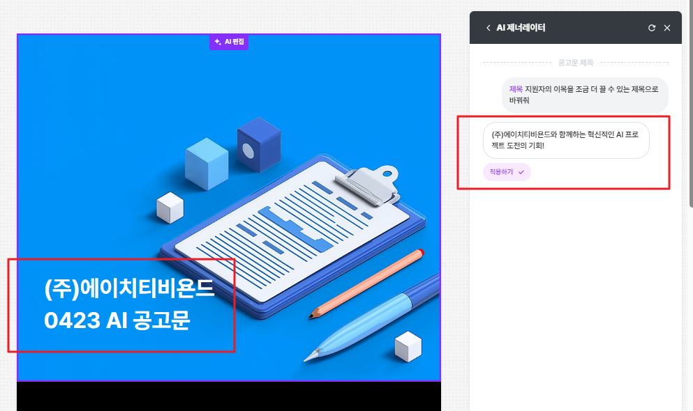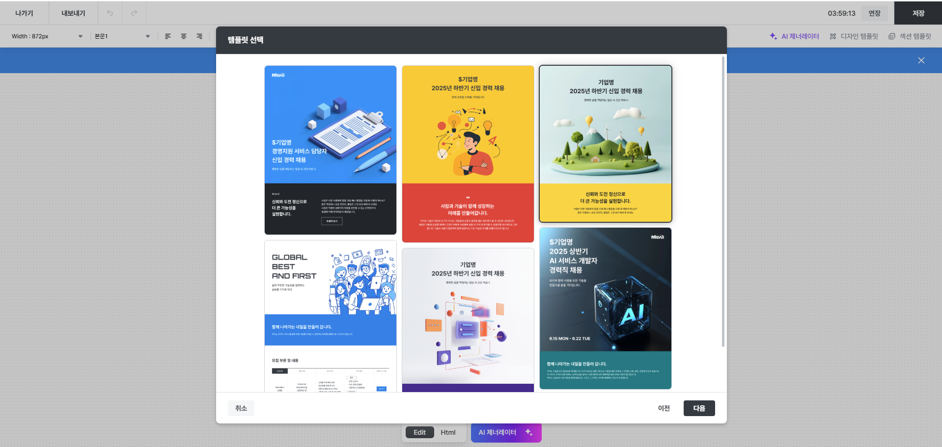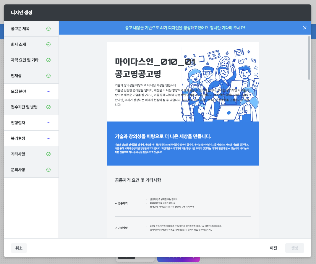 템플릿을 선택하여 다음을 클릭하면 공고 내용을 기반으로 AI가 디자인을 생성합니다.