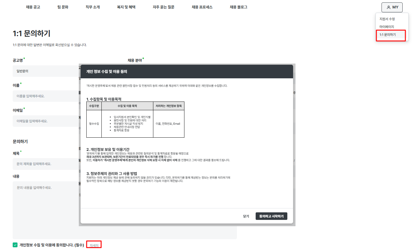 지원자 Q&A 동의서 노출 화면 (채용사이트 빌더 v1)