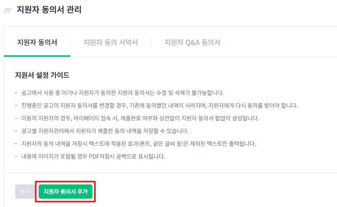 - 공고에서 사용 중이거나 지원자가 동의한 지원자 동의서 및 서약서는 수정 및 삭제가 불가능합니다.
