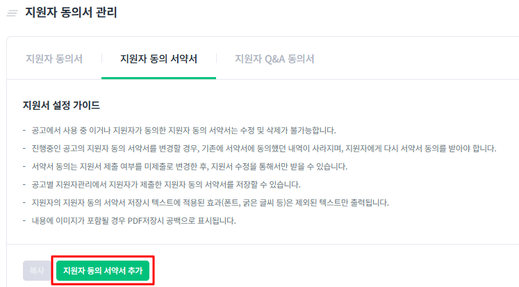 - 진행 중인 공고의 지원자 동의서 및 서약서를 변경할 경우, 기존에 동의했던 내역이 사라지며, 지원자에게 다시 동의를 받아야 합니다.