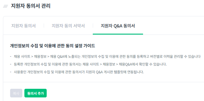 [채용사이트] - [채용정보] - [채용 Q&A][채용 Q&A]에 노출되는 개인정보의 수집 및 이용에 관한 동의를 등록하고 버전별로 이력을 관리할 수 있습니다. 지원자 Q&A 동의서 페이지에서 사용 중인 동의서가 지원자 Q&A 게시판에 연동됩니다.