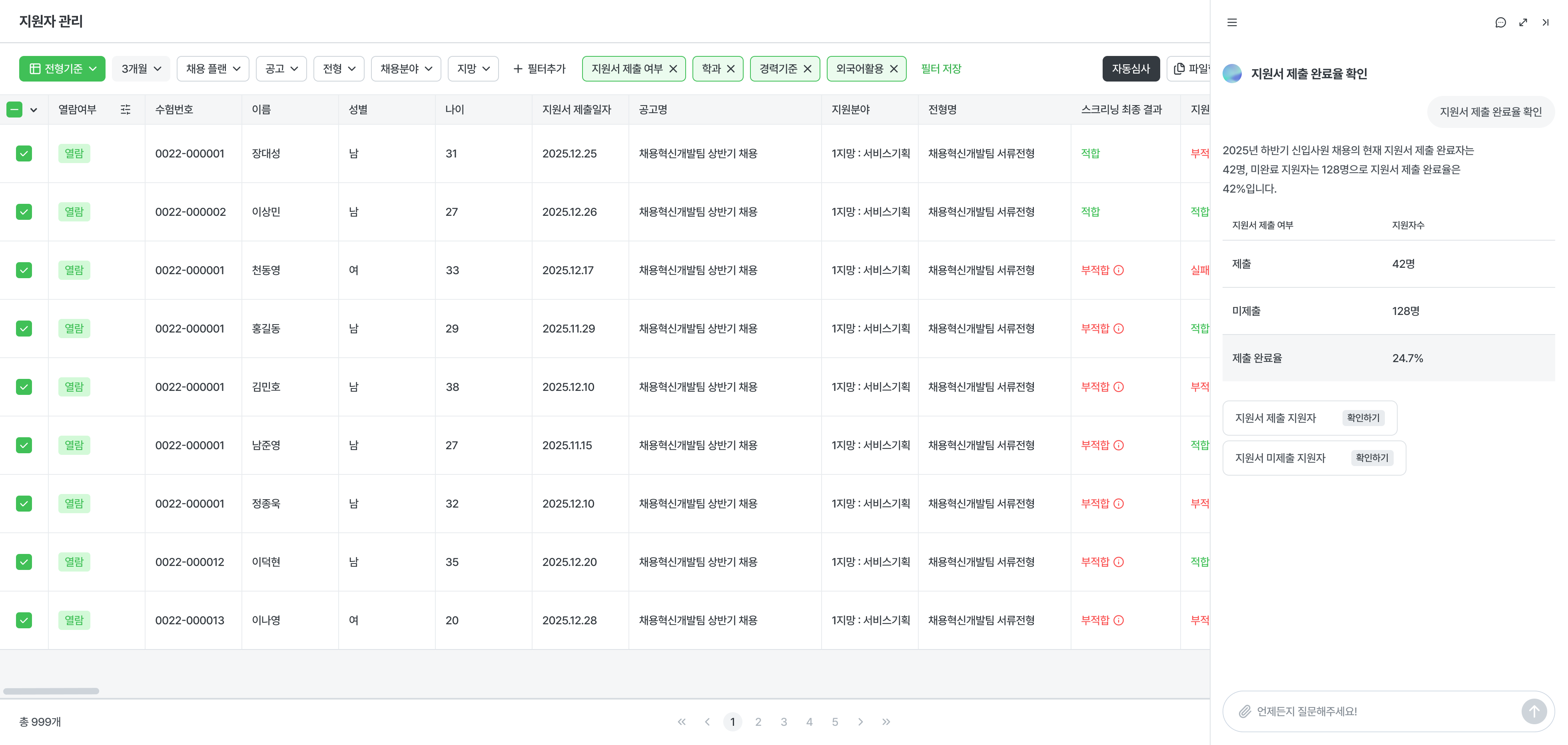 - AI와 대화하며 필요한 데이터를 요청하면 지원자 조회부터 통계 분석까지 채용 전반의 데이터를 자동 분석합니다.