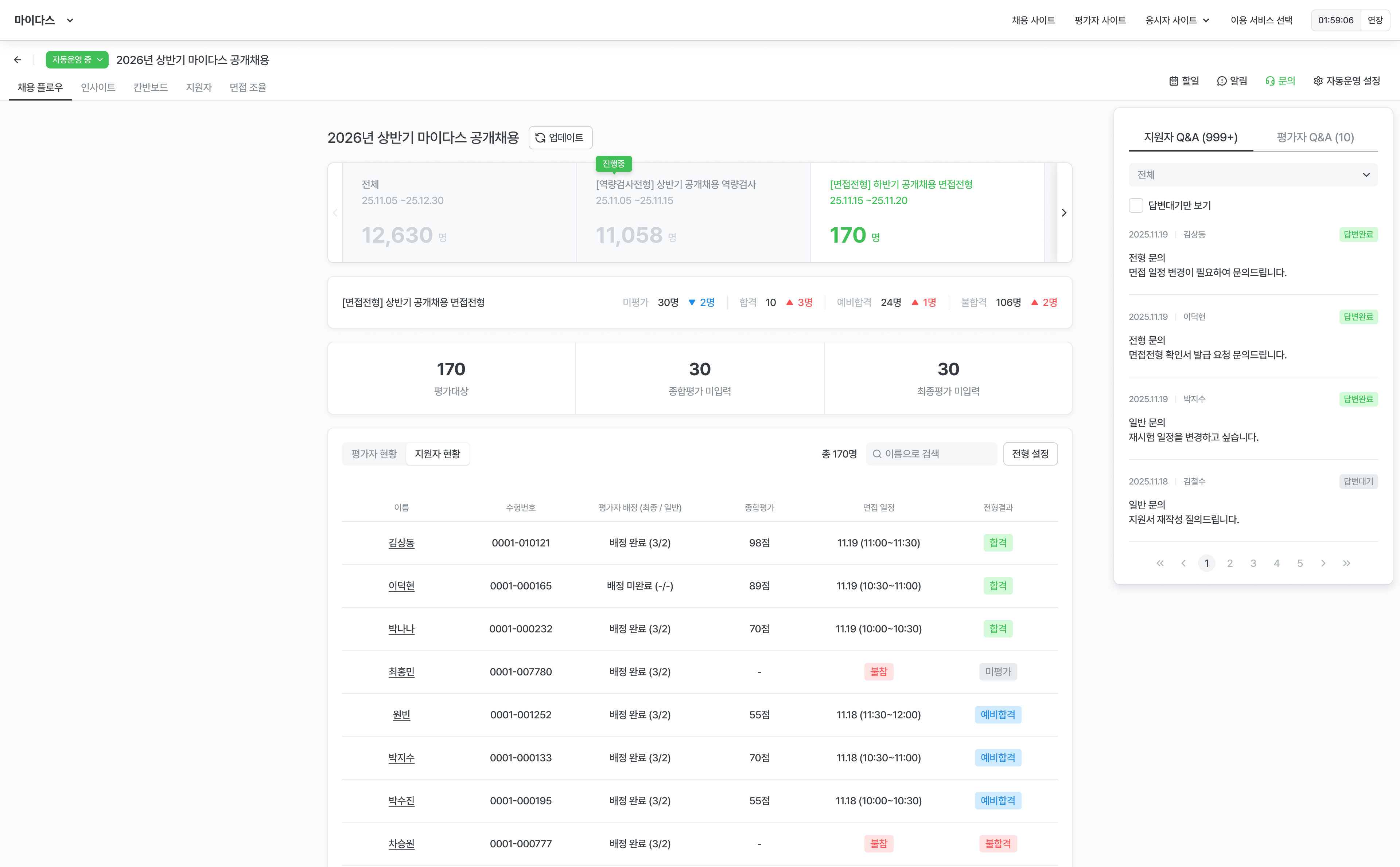 - 지원자와 평가자의 모든 문의를 한 화면에서 실시간으로 확인하고 즉시 대응할 수 있는 통합 채널을 제공합니다.