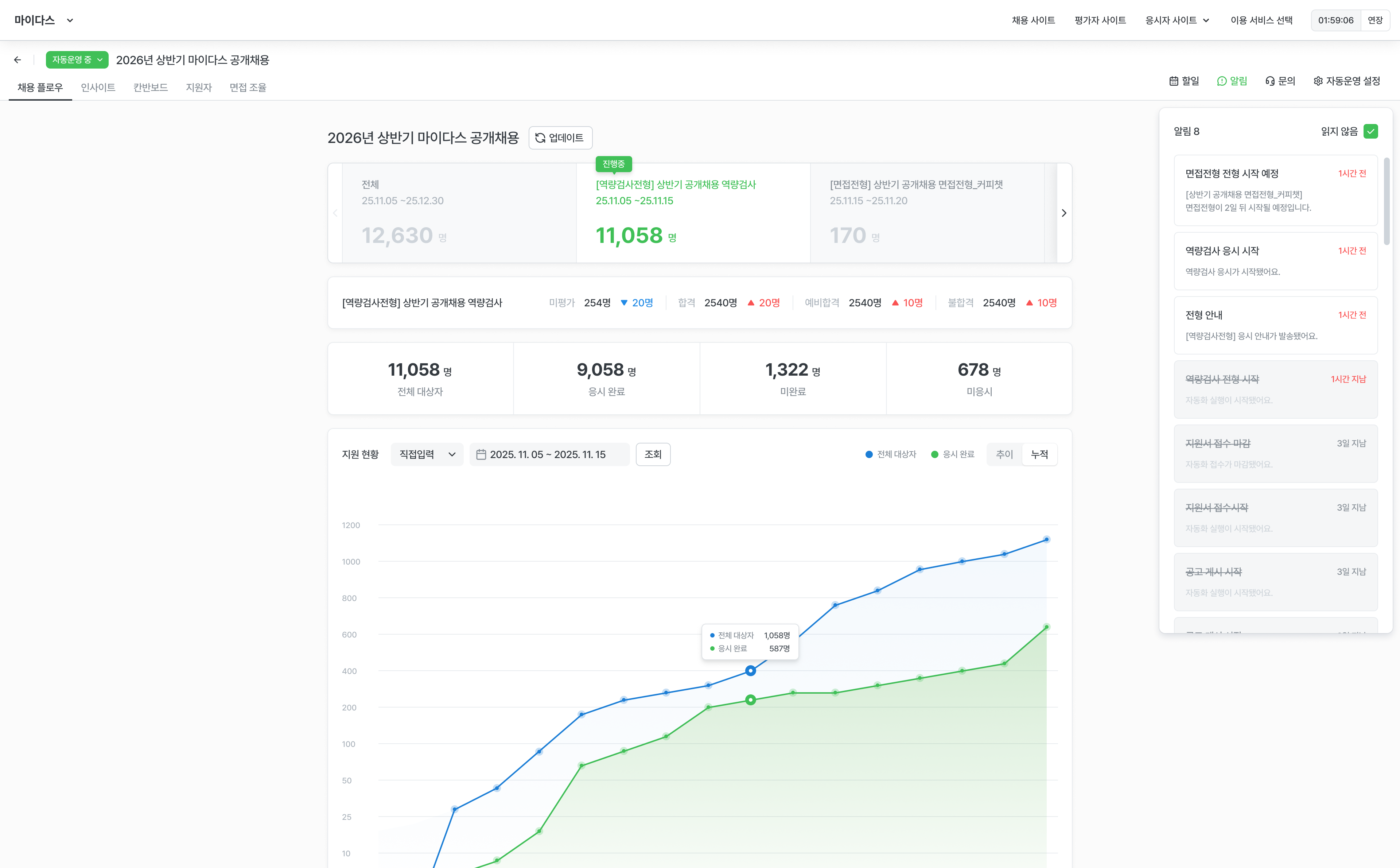 - 공고 게시, 접수 마감, 면접 시작 등 채용의 모든 세부 이벤트를 실시간 알림 카드 형태로 즉시 제공합니다.