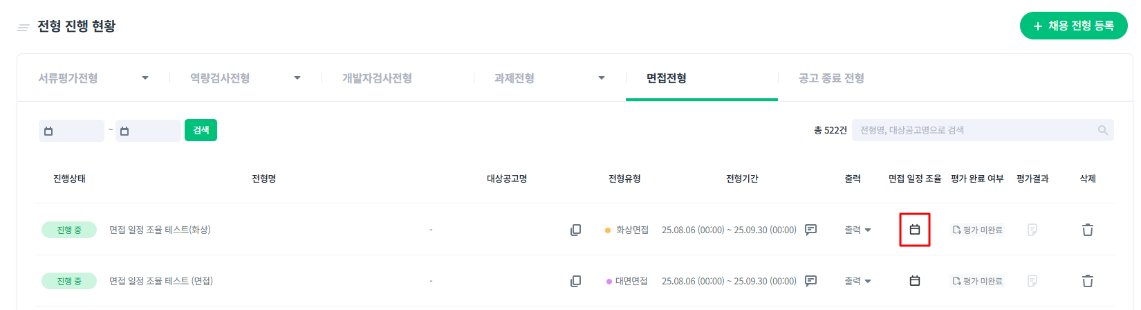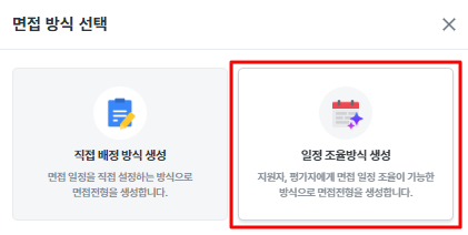 면접 방식 선택 시, 일정 조율방식 생성 으로 진행을 하는 경우 일정 조율 기능을 활용하여 면접 전형을 생성하게 됩니다.