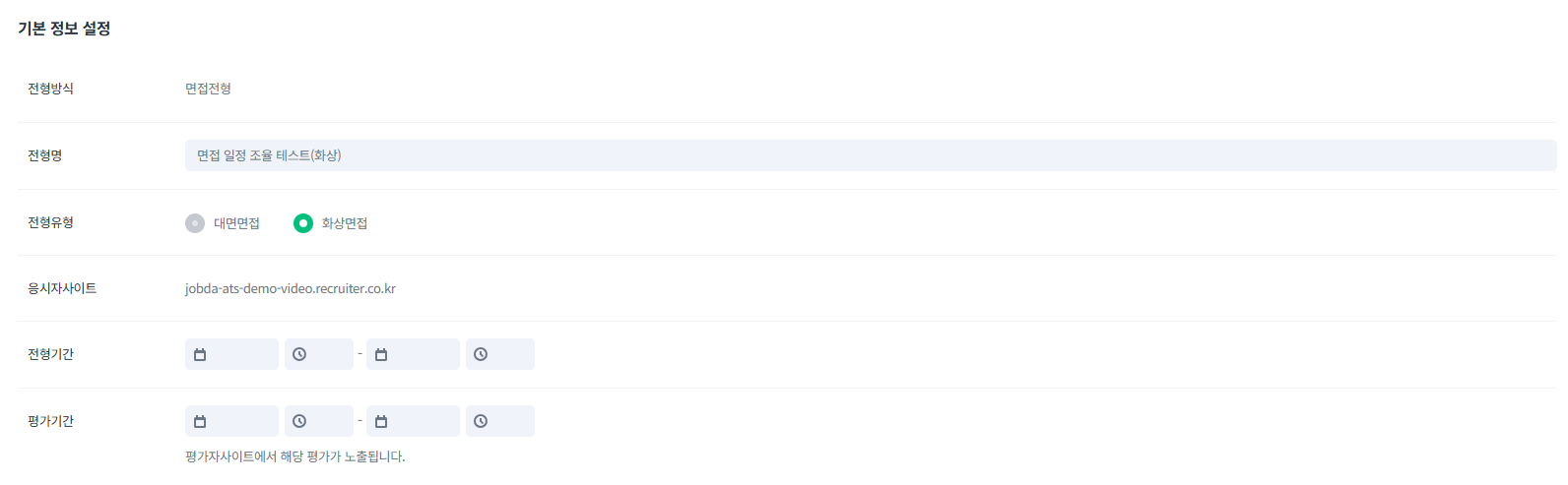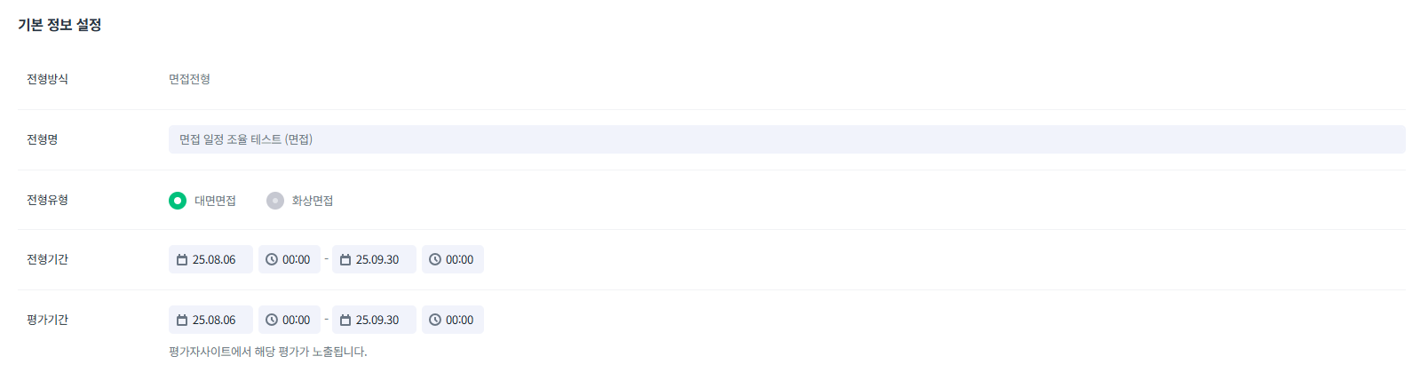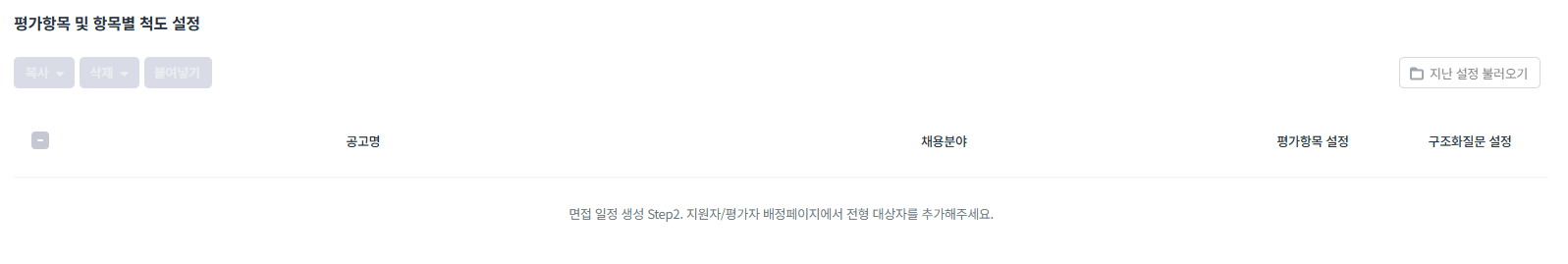 면접전형 내용과 동일하며 평가항목 및 항목별 척도 설정에 노출되는 내용은 면접 일정 생성 Step2. 지원자/평가자 배정페이지에서 전형 대상자를 추가해야 합니다.
