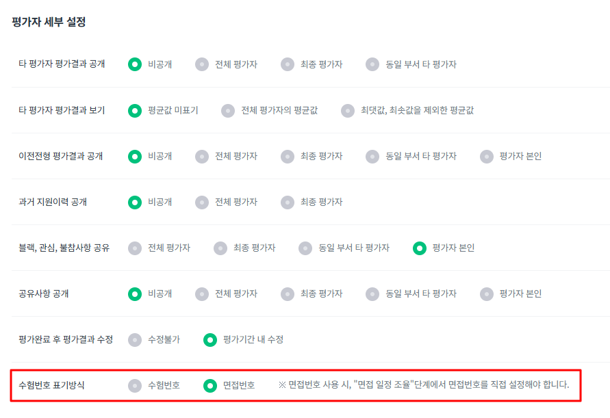 면접전형 내용과 동일하며 수험번호 표기방식을 면접번호로 설정 시, "면접 일정 조율"단계에서 면접번호를 설정합니다.
