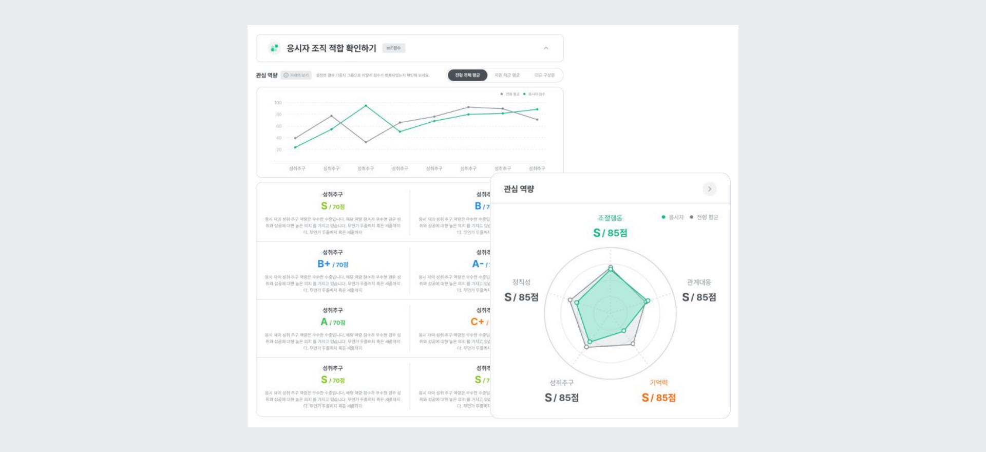 관심 있는 역량을 선택하면 해당 역량에 대한 결과만 집중적으로 검토하고, 전형 및 직군 평균과 비교 분석할 수 있습니다. 핵심 역량에 대한 지원자의 수준별 특성을 확인하고, 위젯을 활용해 보다 직관적인 평가가 가능합니다.