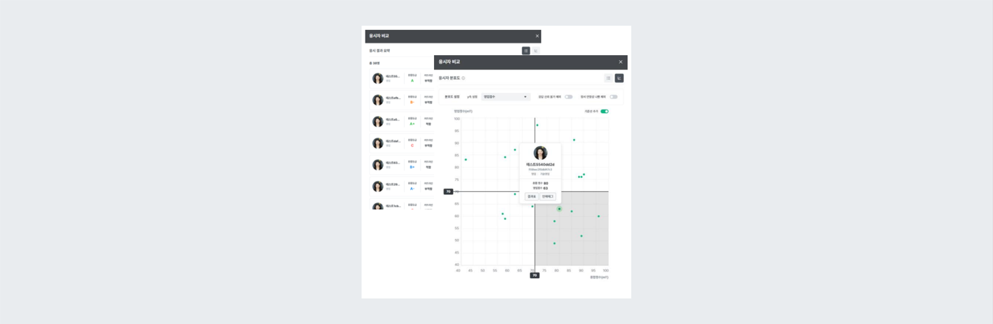 역량검사 전형 종료 후, 응시자들에 대한 평가 기준을 수립하여 합격자 및 불합격자를 지정할 수 있습니다. 생성된 평가항목 점수와 기존 역량들에 대한 커트라인 점수를 설정하여 기준에 부합하거나 미달된 인원을 확인할 수 있습니다.