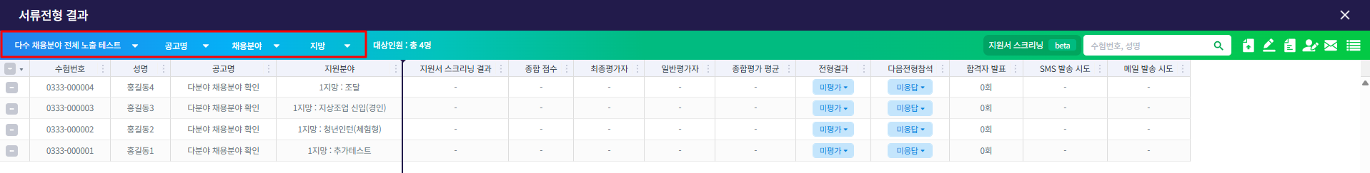 각 전형에는 평가자가 배정되며, 설정하는 평가 척도에 따라 평가자는 지원자의 합불 여부를 판가름하는 평가 결과를 부여합니다. 평가 결과 버튼을 클릭하면 각 평가자가 각 지원자에게 부여한 결과를 한 곳에서 확인할 수 있는 그리드가 노출됩니다. 특정 전형의 공고 / 채용분야 / 지망을 필터링 하시어 확인할 수 있으며 우측 상단 버튼을 통해 다양한 기능을 제공하고 있습니다. 그리드에 대한 자세한 설명은 하기 상세 설명을 통해 확인 가능합니다.