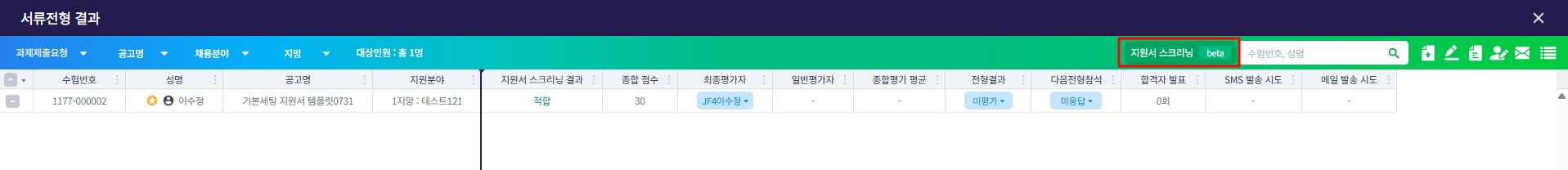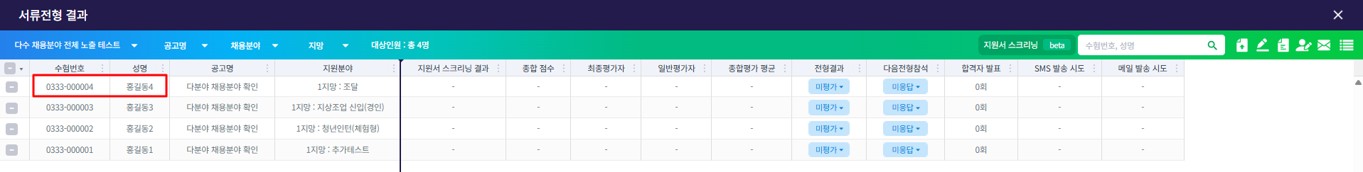 - 검색란을 통해서 성명, 수험번호 등으로 지원자를 검색할 수 있습니다.