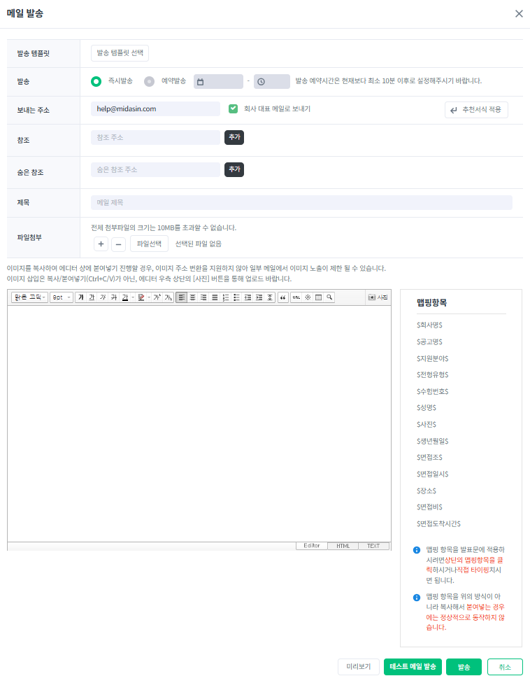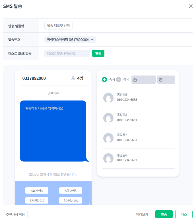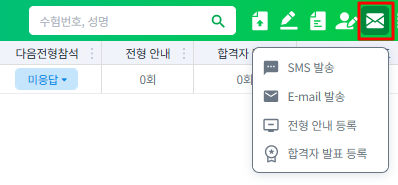 SMS/이메일 발송 기능을 통해 지원자에게 개별 메세지를 전송할 수 있으며, 전형안내 및 합격자 발표도 가능합니다.