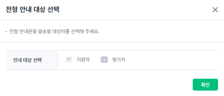 전형 안내 등록 버튼을 통해 전형 안내가 가능합니다. 안내 대상을 선택하고 확인을 클릭하면 상세설정 페이지로 이동되며, 상세한 설명은 개별 대상자 안내 파트에서 확인하실 수 있습니다.