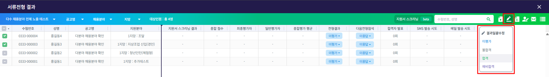 그리드에서도 일괄적으로 지원자의 전형결과를 수정할 수 있습니다. 전형결과를 수정하고자 하는 지원자들을 선택하신 후 하기 결과 중 하나로 클릭 시 일괄 수정됩니다.