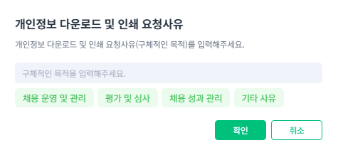 지원자를 선택 후 전형 결과 양식/데이터 다운 버튼 클릭 시 다운로드 메뉴로 이동 됩니다. 해당 메뉴에서 다운로드 받는 파일이 다운로드 가능 상태로 변경될 때까지 기다린 후 다운로드 시 요청 사유를 입력 후 다운로드 파일을 확인하실 수 있습니다.