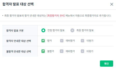 합격자 발표 등록 버튼을 통해 전형의 합격 및 불합격자 발표가 가능합니다. 전형 안내 및 최종 합격자 발표에 대한 상세한 설명은 개별 대상자 발표 파트에서 확인하실 수 있습니다.