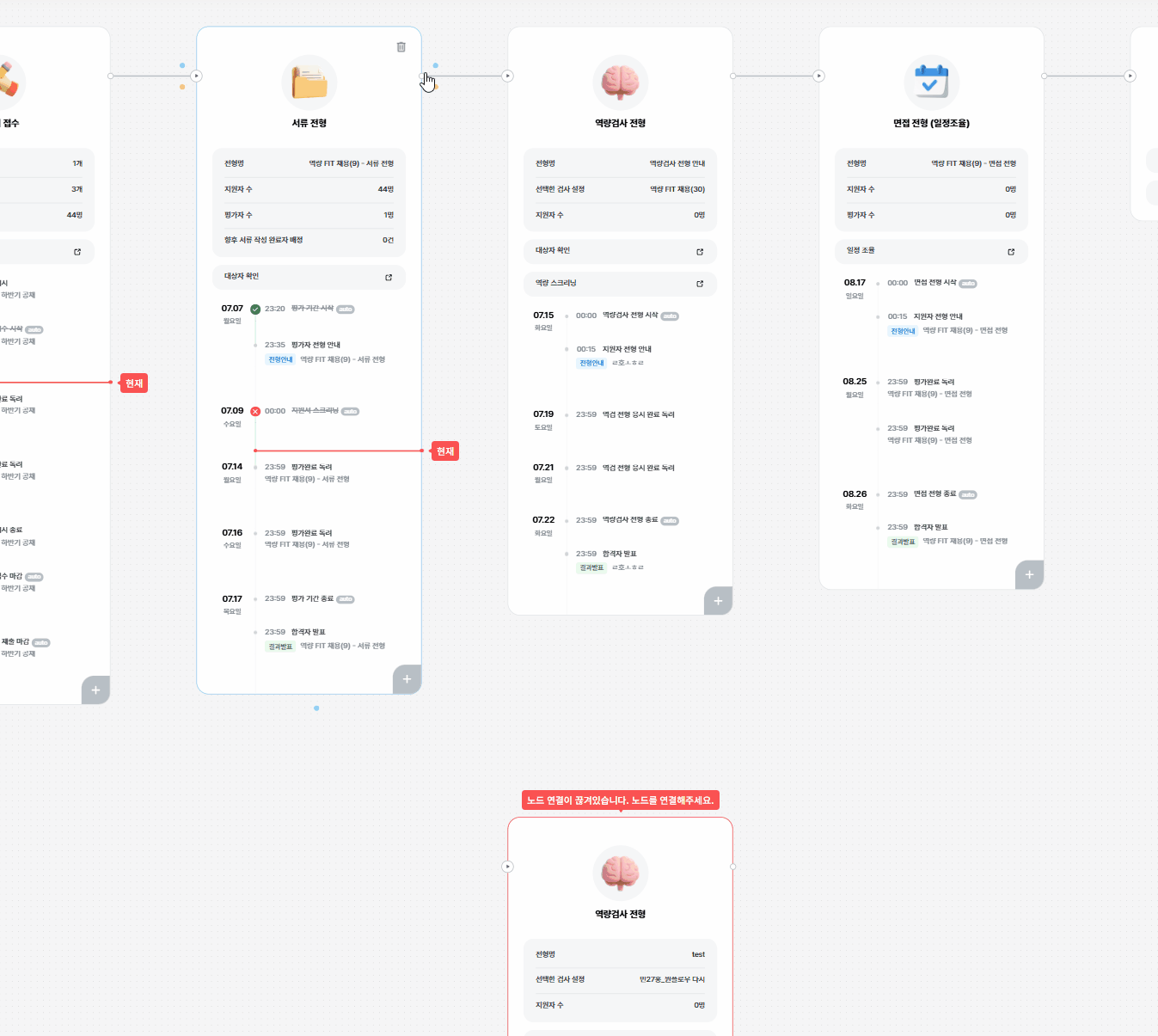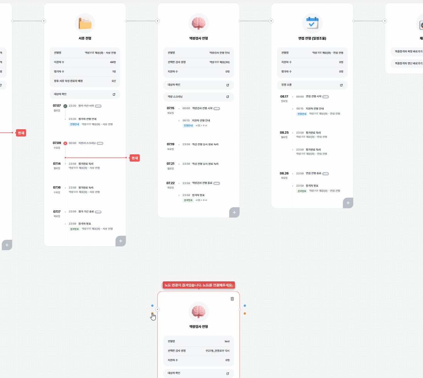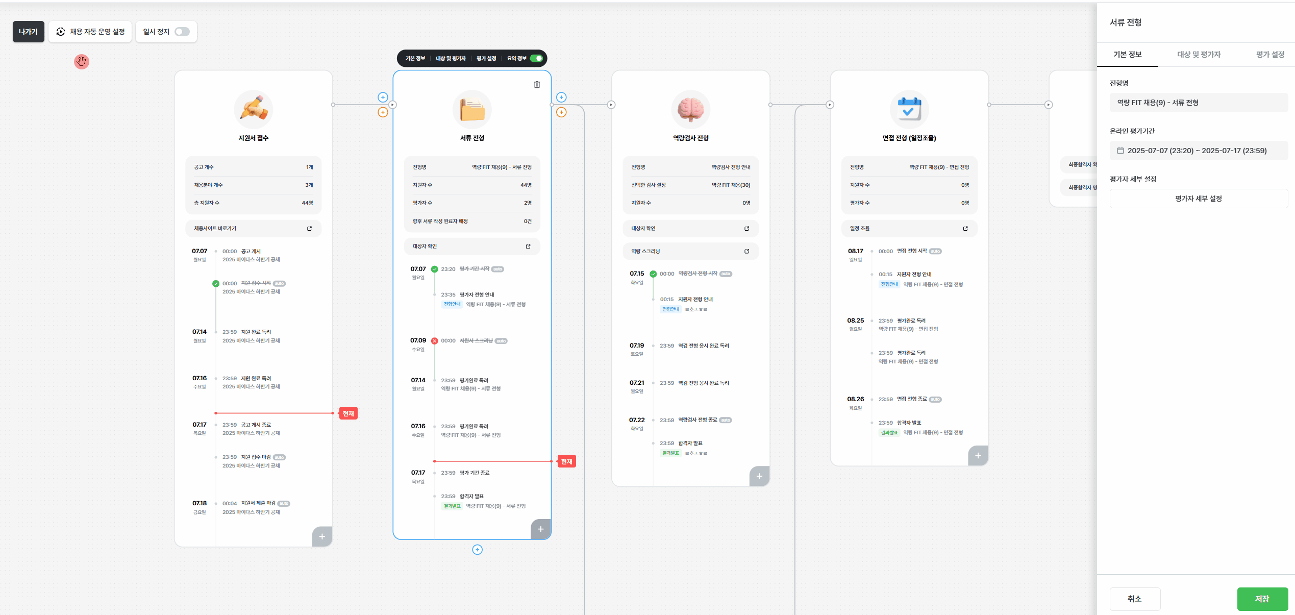 노드는 반드시 연결되어야 하며, 연결된 흐름을 따라 지원자가 진행됩니다.
