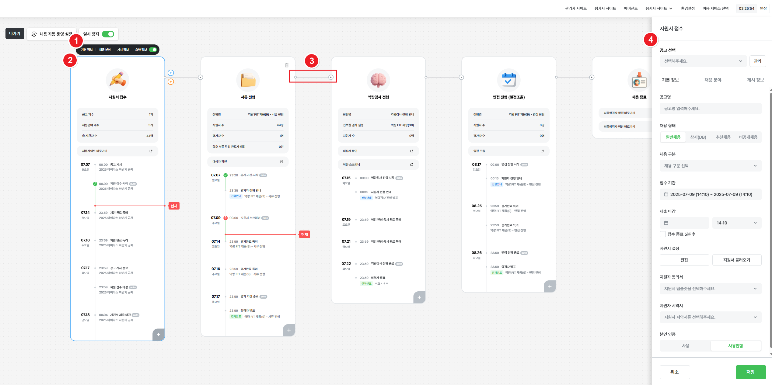 전형별 상세 설정을 편집할 수 있습니다. ex. 지원서 접수의 경우 ) 기본정보, 채용 분야, 게시 정보