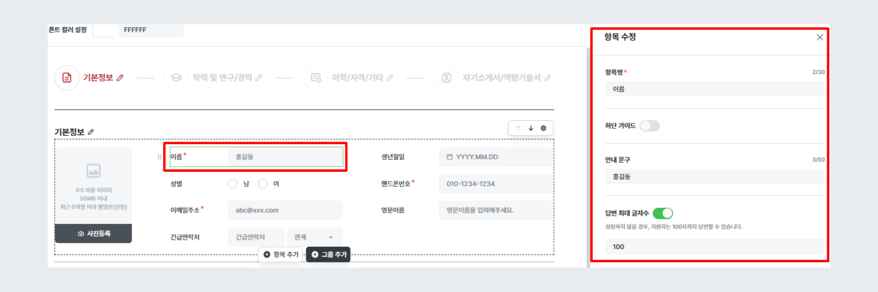 실제 지원자가 작성하게 될 지원서의 항목을 구성하는 메뉴입니다.