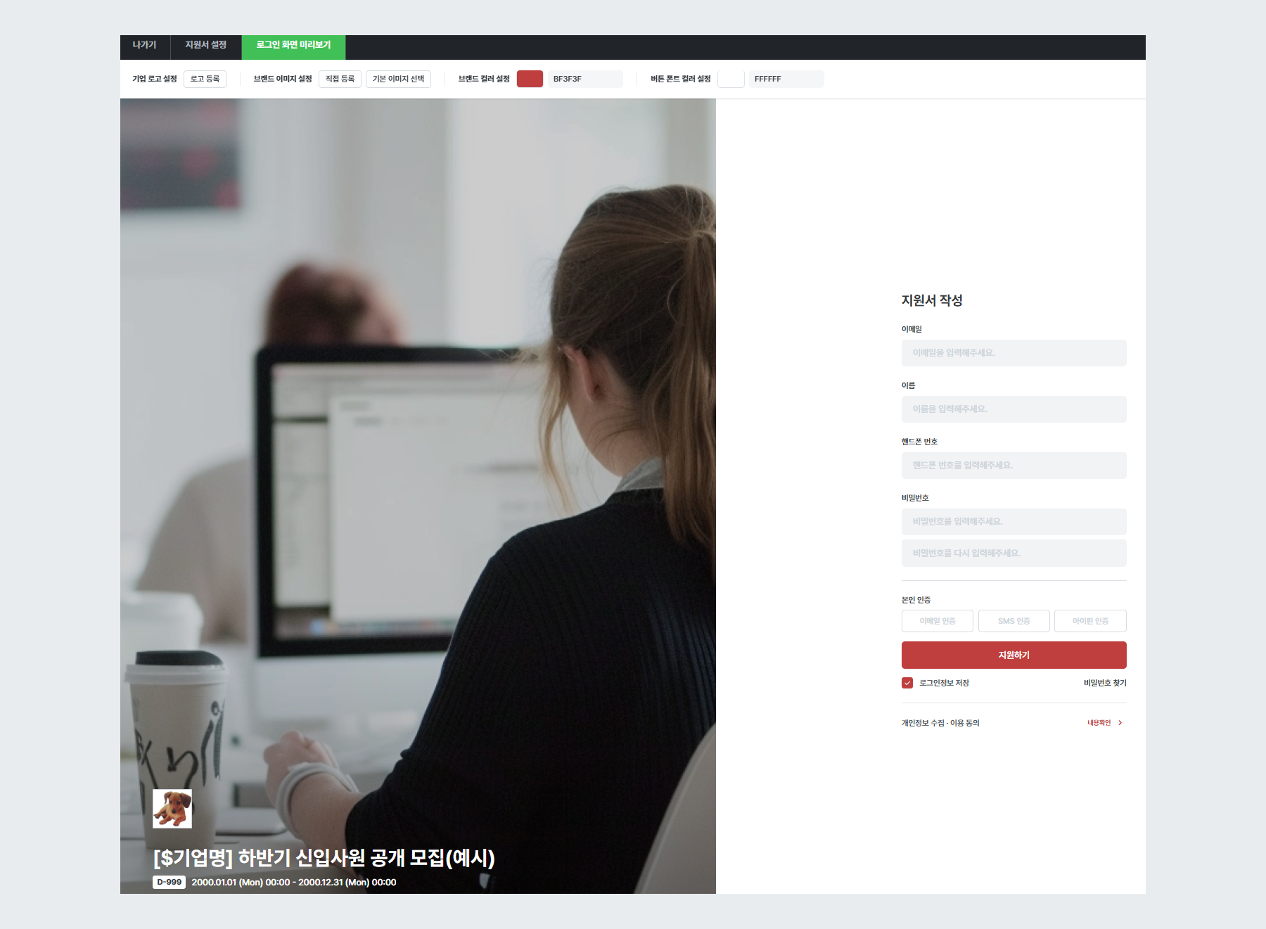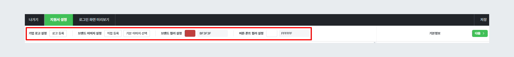 - 상단에서 기업 로고, 브랜드 이미지, 브랜드 컬러 및 버튼 폰트 컬러 설정이 가능합니다.