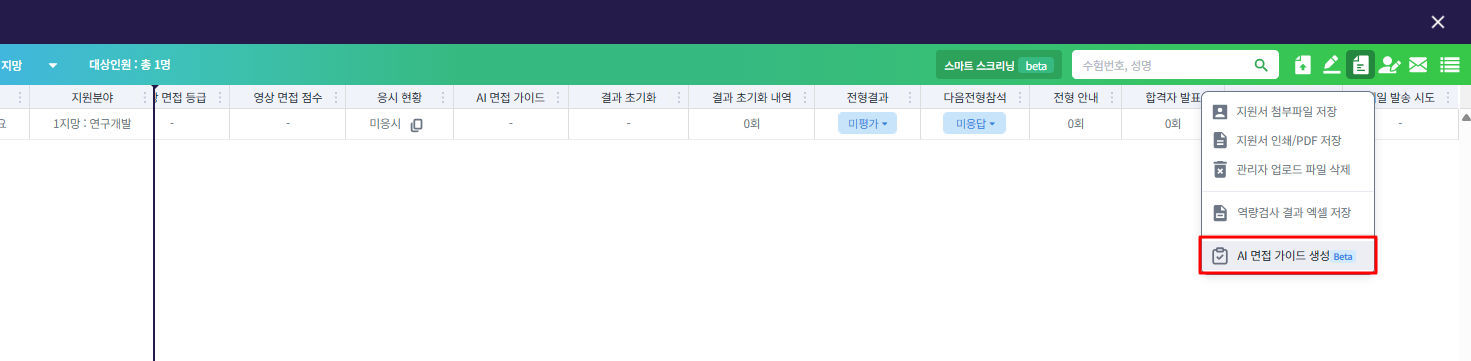 - 설정한 AI 면접 가이드는 관리자 사이트 내의 역량검사 전형 결과 그리드 페이지에서 생성할 수 있습니다.