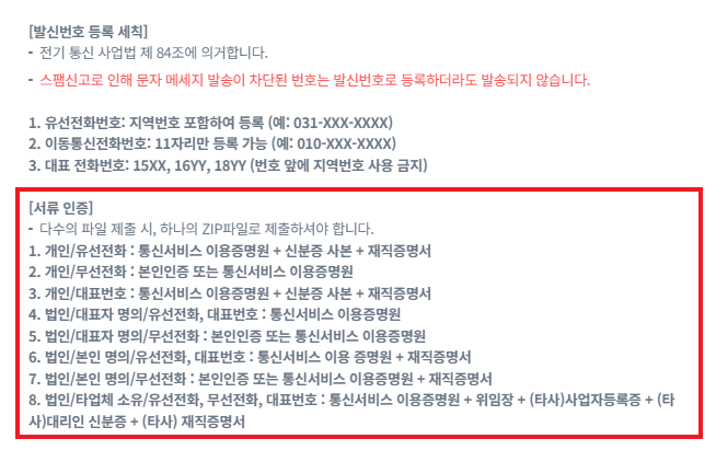 최근 SMS 발신번호 추가 프로세스 관련 업데이트가 있었고, 관련 사항 및 첨부 서류 관련 내용은 SMS 발신번호 정리를 통해서 확인 부탁 드립니다.